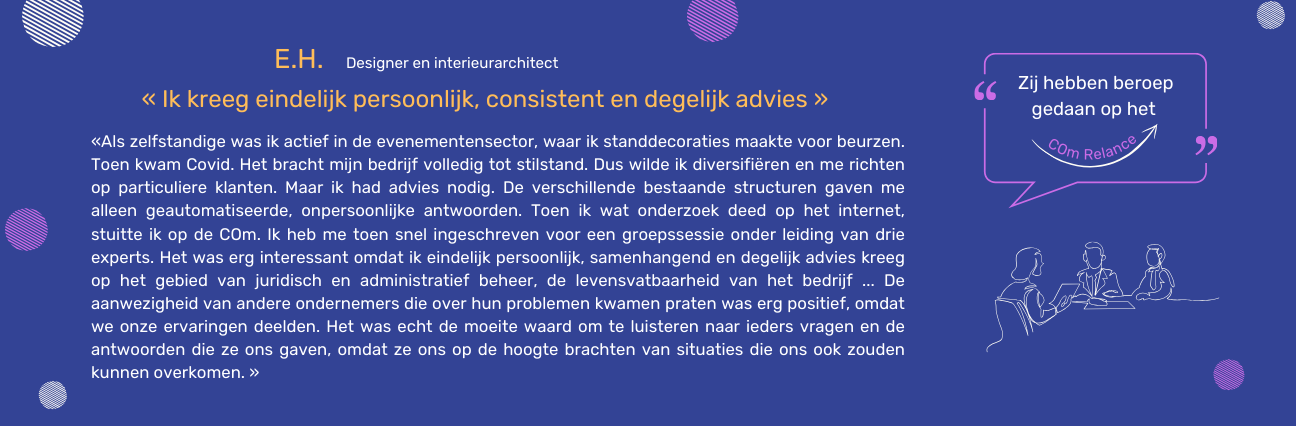 Elke week bieden wij evenementen aan die speciaal zijn ontworpen om uw vragen te beantwoorden en oplossingen te bieden. In zowel individuele als collectieve sessies staan onze experts klaar om naar u te luisteren, u te begeleiden en vooral concrete oplossingen voor uw situatie te vinden. Vaker dan u denkt, zijn er oplossingen voor uw probleem. Faillissement is niet de enige mogelijke uitweg! Hier komen wij, als Kamer van Koophandel, in actie om u te helpen de uitdagingen op uw ondernemerspad aan te pakken. Als u uw anonimiteit wilt behouden, is dat mogelijk.